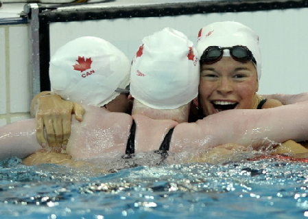 Valerie Maison Grand (R) of Canada celebrates with teammates Chelsey Gitell (C) and Cote Kirby (L) after winning the gold medal in the women's 100m butterfly S13 final during the 2008 Beijing Paralympic Games at the National Aquatic Center also known as the water cube in Beijing, September 7, 2008. [Agencies]