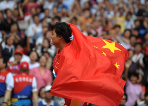 China's Yao Juan reacts after winning Women's Javelin Throw F42-46 at the National Stadium, or Bird's Nest, in Beijing, September 8, 2008. Yao won China's 1st athletics gold at Beijing Paralympics. [Sohu.com]