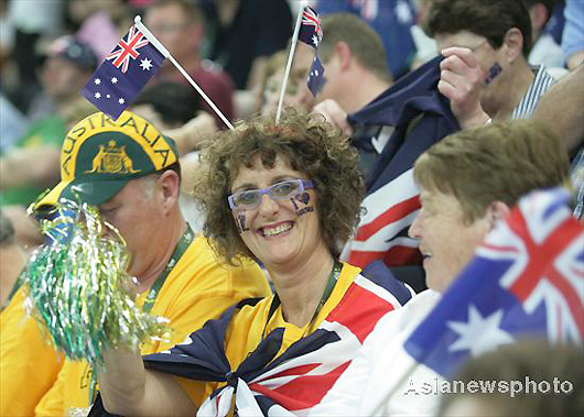 Australian spectators cheer for swimmers inside the Water Cube at the Paralympics Games, September 8, 2008. [Asianewsphoto]