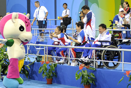 The mascot "Fu Niu Lele" , the mascot of the Beijing 2008 Paralympic Games plays entertains with some Korean athletes at the Beijing Boccia court, Sept. 8, 2008. [Xinhua]