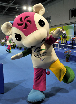 The mascot "Fu Niu Lele" , the mascot of the Beijing 2008 Paralympic Games poses for picture at the Beijing Boccia court, Sept. 8, 2008. [Xinhua]