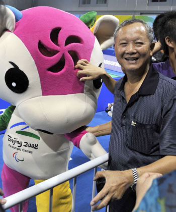 The mascot "Fu Niu Lele" , the mascot of the Beijing 2008 Paralympic Games and poses for a picture with a spectator pose for picture at the Beijing Boccia court, Sept. 8, 2008. [Xinhua]