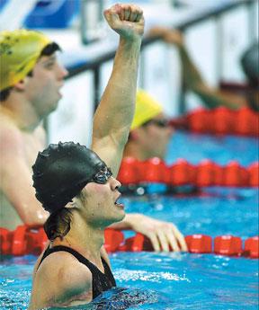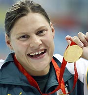 South Africa's Natalie Du Toit shows her gold medal after winning the women's 100m freestyle S9 finals at the Beijing 2008 Paralympic Games September 8, 2008. [Agencies]