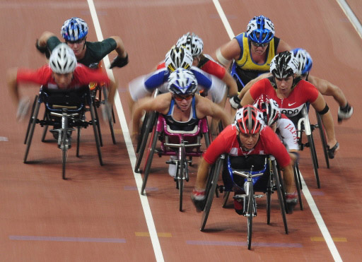 Athletes compete in the women's 5000m T54 final during the 2008 Beijing Paralympic Games at the National Stadium in the Chinese capital on September 8, 2008. Diane Roy of Canada beat Shelly Woods of Great Britain to win gold. [Agencies]