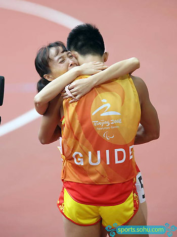 Partially sighted runner Wu Chunmiao of China (L) is hugged by her guide (R) after she won gold in the final of the 100m T11 final A at the National Stadium in Beijing on September 9, 2008.[sohu.com]