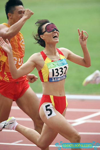 Runner Wu Chunmiao of China (L) dashes to the finish line in the final of the 100m T11 final A at the National Stadium in Beijing on September 9, 2008.[sohu.com]