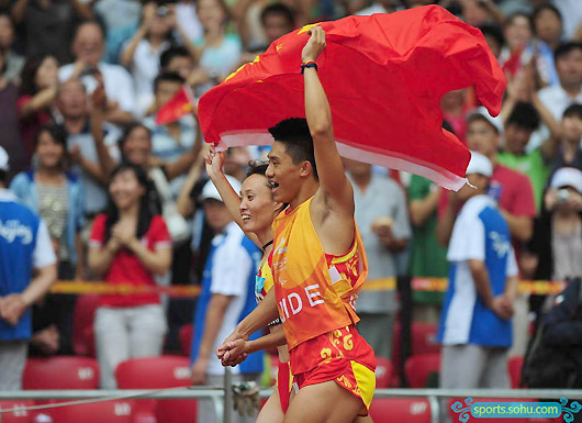Runner Wu Chunmiao of China (L) and her guide hold the Chinese national flag after winning the 100m T11 final A at the 2008 Beijing Paralympic Games at the National Stadium in Beijing on September 9, 2008.[sohu.com]