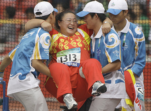 China's Chen Liping (C) laughs as she is carried by volunteers during the women's shot put F54-56 final at the National Stadium, also known as the Bird's Nest, during Beijing 2008 Paralympics Games September 9, 2008. [Agencies]