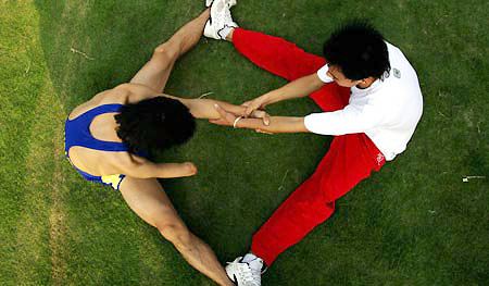 Yun Weiping (l), who lost his right arm at age of 16, stretches during a training session at a stadium in Hefei, capital of east China's Anhui Province, Sept. 2, 2008. Yun, once the 100 meters and 200 meters national champion, failed in last year's trials competition for the Beijing 2008 Paralympic Games, keeps training as he cherishes a dream that will lead him to success in the future compititions. [Xinhua]