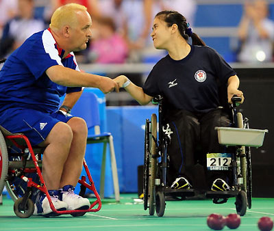 Nigel Murray (L) of Great Britain congratulates Kwok Hoi-ying (R) from Hong Kong of China after their boccia individual BC2 category gold medal final during the Beijing Paralympic Games on September 9, 2008 at the Fencing Hall of the National Convention Center in Beijing. Kwok defeated Murray 5-3 to win gold. [Agencies]