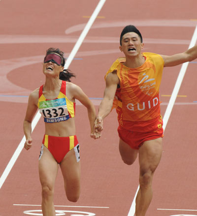 Wu Chunmiao of China (L) runs to win gold with her guide in the final of the 100m T11 final A during the 2008 Beijing Paralympic Games at the National Stadium in the Chinese capital on September 9, 2008. [Xinhua]