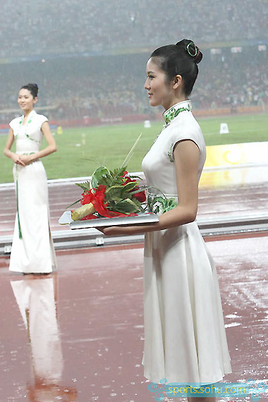 A victory hostess smiles despite the pouring rain at the awarding ceremony inside the National Stadium, or Bird's Nest, during the Paralympic Games in Beijing, September 9, 2008. [Sohu.com]