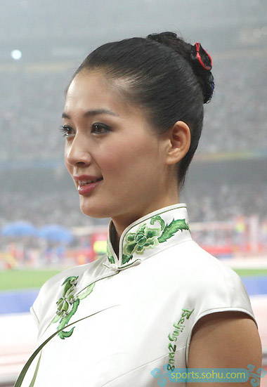 The smile of a victory hostess shines through the rain at the awarding ceremony inside the National Stadium, or Bird's Nest, during the Paralympic Games in Beijing, September 9, 2008. [Sohu.com]