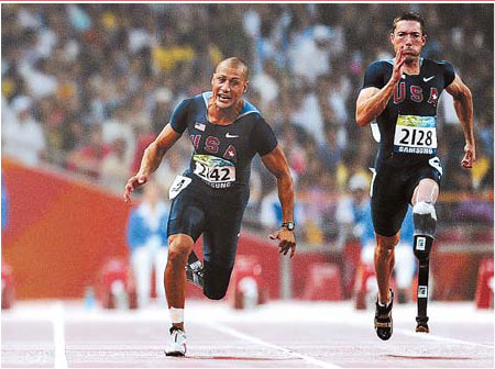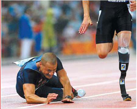 The photo sequence shows US sprinter Marlon Shirley (Top) running alongside compatriot Brian Frasure in the final of the 100m T44 September 9, 2008; tripping and falling over; picking himself and resuming his run; and being attended to by volunteers. [AFP/ Xinhua/CNS/AP]