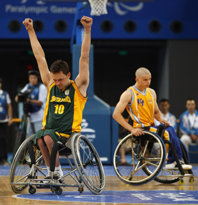 South Africa's Marius Papenfus celebrates their win as Sweden's Joakim Linden passes by after their men's wheelchair basketball preliminaries Group A match at the Beijing 2008 Paralympic Games, September 10, 2008. [Agencies]