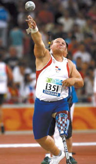 Croatia's Darko Kralj breaks the world record on the way to gold during the men's shot put F42 competition finals. [Agencies]