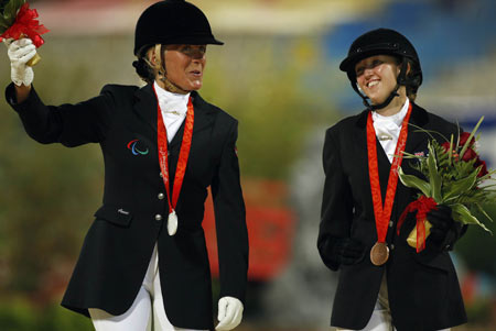 Ann Cathrin Lubbe of Norway (L) and Georgia Bruce of Australia celebrate with their silver and bronze medals respectively after competing in the equestrian individual freestyle test grade IV at the Beijing 2008 Paralympic Games in Hong Kong September 10, 2008. [Agencies]