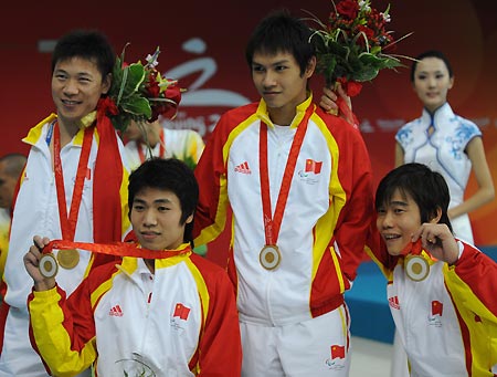 China's He Junquan, Du Jianping, Yang Yuanrun and Tang Yuan(L-R) pose for photos in the awarding ceremony for men's 4x50m freestyle 20 pts during the Beijing 2008 Paralympic Games at the National Aquatics Center in Beijing, Sept. 11, 2008. China claimed the title and broke the world record of the event with a time of 2 mins 18.15 secs. [Xinhua]