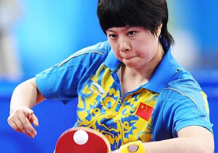 Lei Lina of China returns a shot during the women's individual class 9 gold medal match against her compatriot Liu Meili at the Beijing 2008 Paralympic Games table tennis event in Beijing, China, Sept. 11, 2008. Lei won the match 3-0 and claimed the title. [Xinhua]