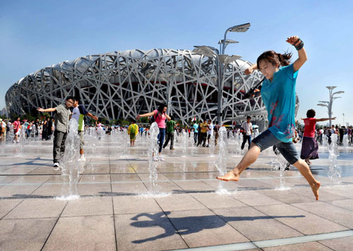 A girl plays with the music fountains in front of the National Stadium, or the Bird's Nest during the 2008 Beijing Paralympic Games September 11, 2008. [Xinhua]
