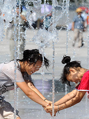 Two women play with the music fountains in front of the National Stadium, or the Bird’s Nest during the 2008 Beijing Paralympic Games September 11, 2008. [Xinhua]