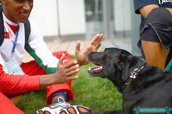 A Portuguese athlete plays with his guide dog "Nida" at the Beijing Paralympic Village, September 8, 2008. [Sohu.com]