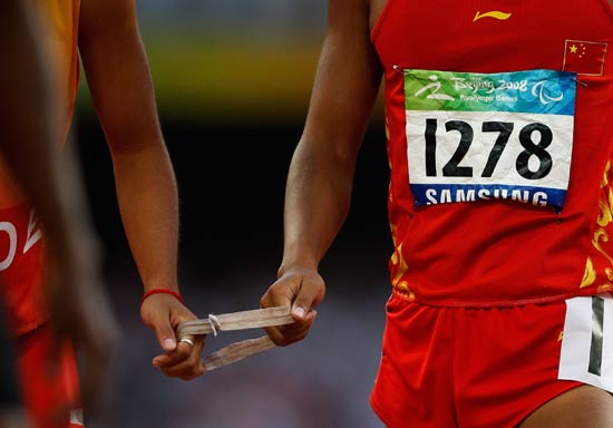 A runner and his guild compete at the National Stadium in Beijing on September 13, 2008[Xinhua]
