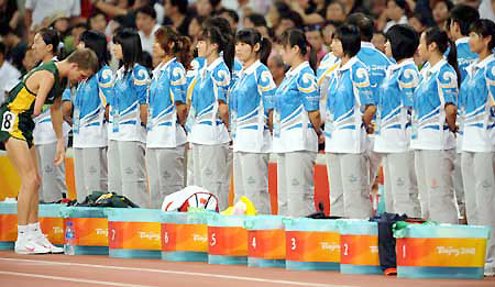 Volunteers are seen on standby during a match of the Beijing Paralympic Athletics event at the National Stadium Sept. 10, 2008. Some 44,000 volunteers are serving for the ongoing Beijing 2008 Paralympic Games and 90 percent of them have worked for the Olympic Games last month. [Xinhua]
