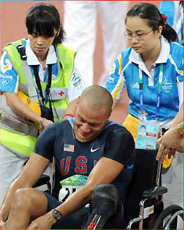 Volunteers help American athlete Marlon Shirley during a match of the Beijing Paralympic Athletics event at the National Stadium Sept. 9, 2008. [Xinhua]