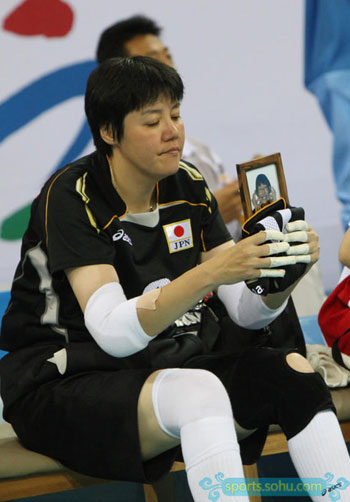 A Japanese athlete holds up a photo of her late teammate when competing in sitting volleyball match during the Beijing Paralympic Games, September 13, 2008. The 21-year-old girl, former member of Japanese sitting volleyball team, had a dream of taking part in the Beijing Paralympics but passed away on August 12, 2008.[Sohu.com]