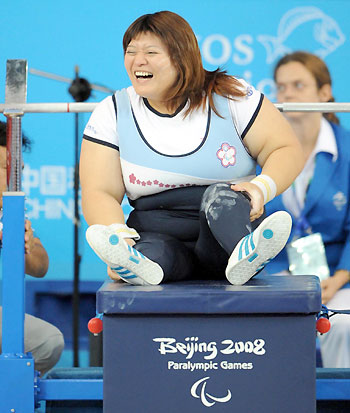 Lin Tzu-hui of Chinese Taipei team celebrates after claiming the women's 75kg category powerlifting during the Paralympic Games in Beijing, September 14, 2008. [Xinhua]