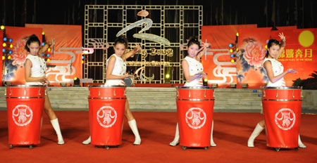 Chinese dancers perform with drums at the flag-raising square at the Beijing Paralympic Village on the Mid-autumn night Sept. 14, 2008. China is celebrating the Mid-Autumn Festival, a traditional Chinese holiday for family reunion and mooncakes, which falls on September 14 this year. [Xinhua]