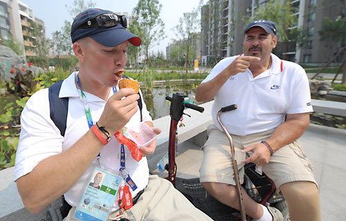 A Paralympian eats a Chinese mooncake in the Paralympic Village, September 14, 2008. Paralympic athletes in Beijing will get a taste of China's Mid-Autumn Festival, which falls on September 14 this year. [Xinhua]