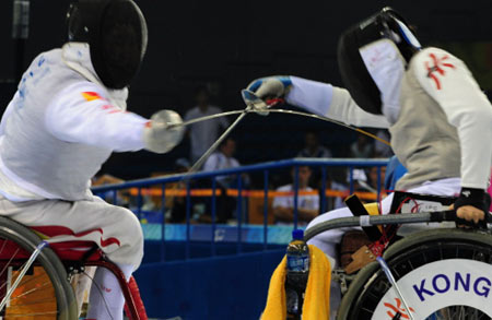 China's Ye Hua (L) competes with Chan Yui Chong (R) from from Hong Kong of China in the women's individual foil wheelchair fencing competition on September 14, 2008 at the Fenching Hall on the Olympic Green in Beijing during the 2008 Beijing Paralympic Games. [Agencies]