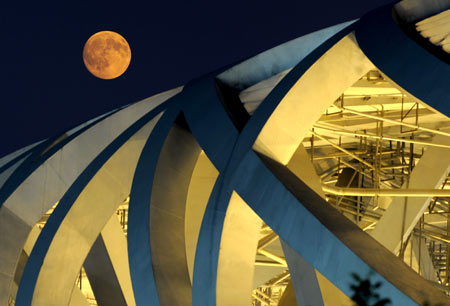 A full moon over the National Stadium, or the Bird's Nest, is seen in Beijing Sept. 14, 2008. The Bird's Nest is now hosting the athletic competition for the 2008 Beijing Paralympic Games. China is celebrating the Mid-Autumn Festival, a traditional Chinese holiday for family reunion and mooncakes, which falls on September 14 this year. [Xinhua]