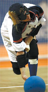Jen Armbruster of the US serves during the women's goalball final against China. USA won 6-5. [Xinhua]
