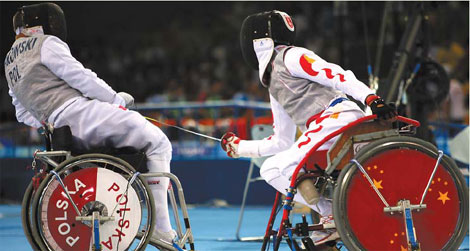 China's Ye Ruyi (right) fights Poland's Stefan Makowski in wheelchair fencing men's individual foil category A preliminary pool C competition. Ye later won the gold in the final. [China Daily]