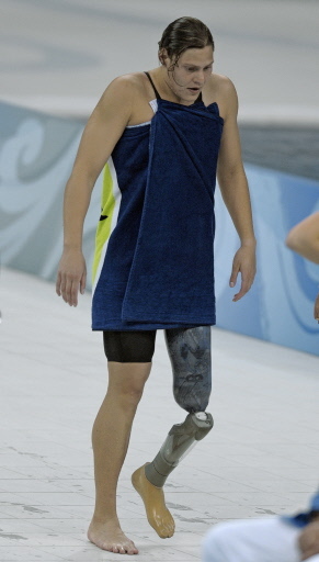 | Natalie Du Toit of South Africa leaves the pool as she won the women's 50m freestyle S9 final during the 2008 Beijing Paralympic Games at the National Aquatics Center in Beijing on September 14, 2008. With five gold and four world records, South African sensation Natalie du Toit completed a perfect Beijing Paralympics Sunday by repeating her Athens successes.[Agencies] |