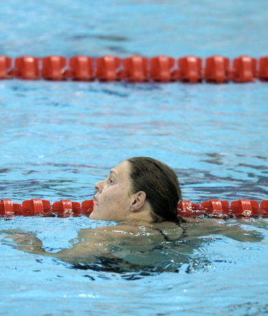 | Natalie Du Toit of South Africa looks at the result board after winning the women's 50m freestyle S9 final during the 2008 Beijing Paralympic Games at the National Aquatics Center in Beijing on September 14, 2008. With five gold and four world records, South African sensation Natalie du Toit completed a perfect Beijing Paralympics Sunday by repeating her Athens successes.[Agencies] |