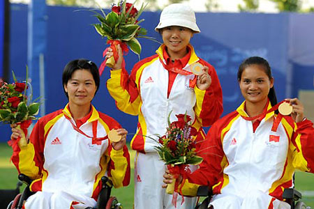 Chinese archers Gao Fangxia (C), Fu Hongzhi (R) and Xiao Yanhong celebrates with their gold medals in the Women's recurve team archery event of the 2008 Paralympic Games in Beijing on September 15, 2008. [Xinhua]