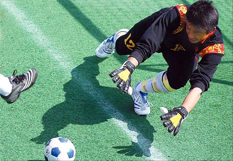 Goalkeeper Xia Zheng of China defends in the men's football 5-a-side B1 preliminary against Brazil. The match ended in a 1-1 draw. [China Daily]