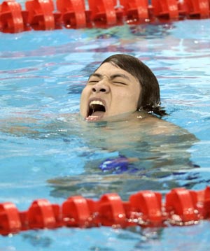 Du Jianping of China reacts after winning the men's 50m backstroke S3 final during the 2008 Beijing Paralympic Games at the National Aquatics Center in Beijing on September 15, 2008. Du won with a new world record of 44.31 sec. [Agencies]