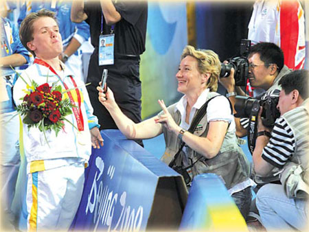 Ukraine's Lidiya Solovyova meets the press after winning and setting a new record at 105.5 kilograms, in the women's -40 kg powerlifting event last Tuesday. Xu Jingxing