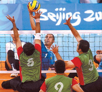 Iran's Jalil Eimery (No 8) and Reza Peidayesh (No 3) try to block a ball during the men's sitting volleyball gold medal match against Bosnia & Herzegovina. Iran won 3-0. [Agencies]