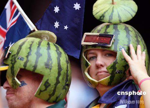 Two Australian spectators with watermelon helmet on the head watch athletic event at Beijing 2008 Paralympic Games on Sept. 14, 2008. [chinanews.com]