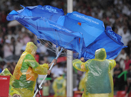 Volunteers lift up a sunshade wavered by the heavy rain in the National Stadium in Beijing September 16, 2008. Heavy rain fell in Beijing at dusk one day before the Paralympics end on Wednesday.[Xinhua]