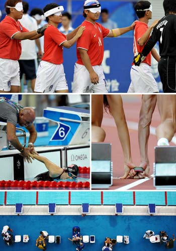(Upper) Members of South Korean players walk into the field during a match of the Football 5-a-side Sept. 13, 2008. (Mid-left) Cheryl Angelelli of the United States gets ready to start during the Women's 100m Freestyle S4 final of the Beijing Paralympic Swimming event Sept. 7, 2008.(Mid-Right) Sun Xin of China gets ready to start with her guide-runner during the Women's 200m T12 round 1 heat 1 of the Beijing Paralympic Athletics event Sept. 15, 2008.(Lower) Athletes makes preparation for a match of Men's 50m Backstroke S2 of the Beijing Paralympic Swimming event Sept. 15, 2008. [Xinhua]