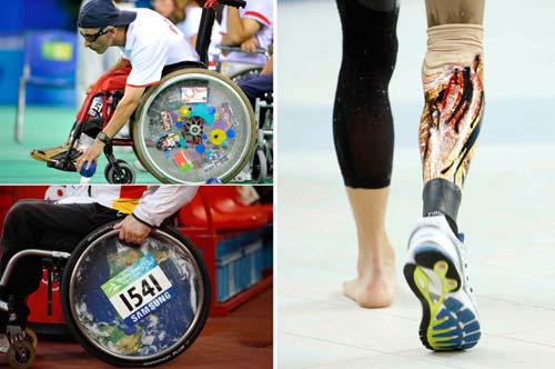 (Upper Left) Fernando Ferreira of Portugal competes in a Boccia match Sept. 11, 2008.(Lower Left) Ulrich Iser of Germany awaits during a Men's Shot Put match Sept. 15, 2008.(Right) Sven Decaesstecher of Belgium competes in the Men's 200m Individual Medley SM10 final of the Beijing Paralympic Swimming event Sept. 11, 2008. [Xinhua]