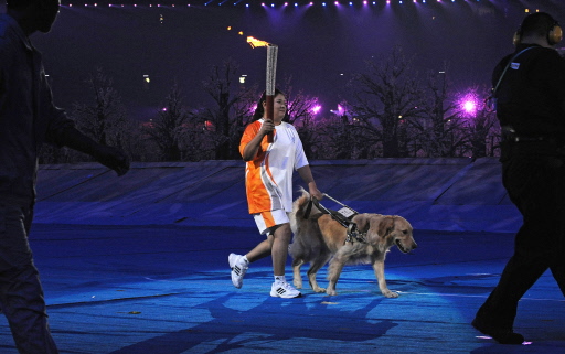 This time the hand-off from one disabled athlete to another is seamless.That was not the case just one month ago. Ping did not bring Lucky with her to the torch relay for the Beijing Olympics. As she made her way through Tian'anmen Square, the torchbearers in front of and behind her did not know she was blind. A passer-by had to tell her when to grab the flame. Ping then ran in zig-zags to hand it to the next person.