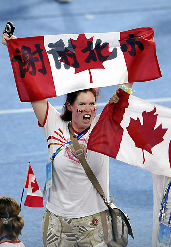 A Canadian Paralympian holds up a banner reading "Thank you, Beijing" as she enters the National Stadium, or the Bird's Nest, in Beijing, September 17,2008. [Xinhua]